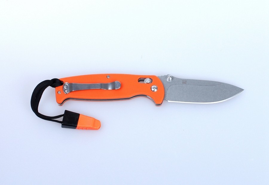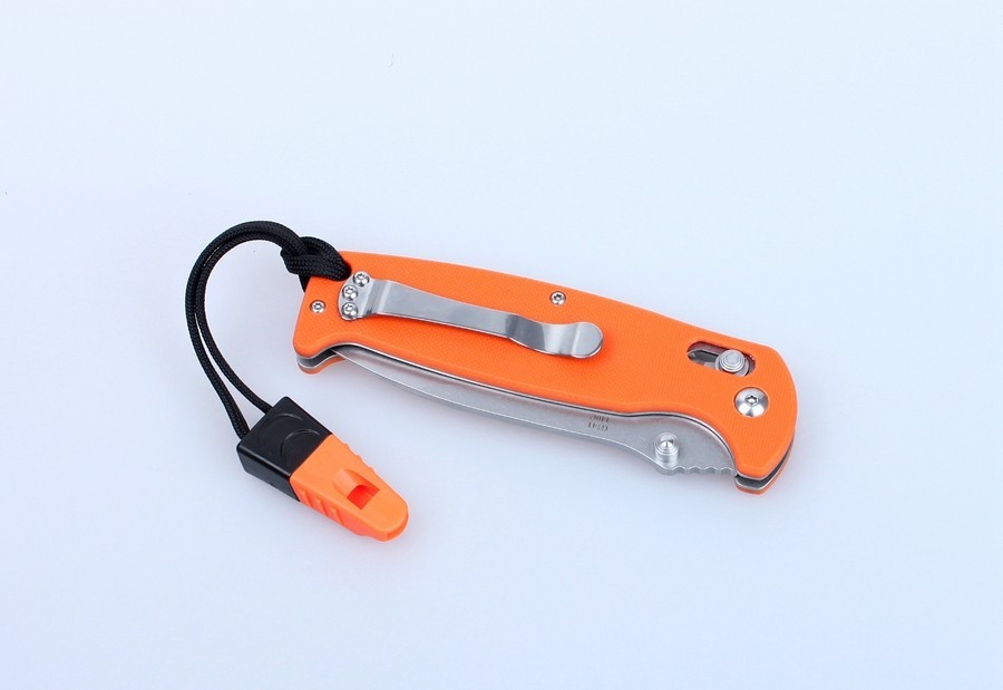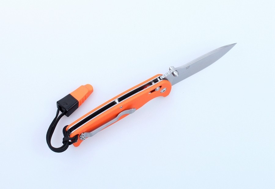 Suprafața sa este tratată folosind tehnica Stonewash, prin urmare puteți vedea urme de materiale de măcinat. Acest tip de tratament face cuțitele aproape fără strălucire, iar zgârieturile mici sunt mult mai puțin vizibile pe ele. Marginea de tăiere este ascuțită complet lin, astfel încât cuțitul tăie ușor și ușor aproape orice material. Lungimea totală a lamei de la margine la dar este de 89 mm. Lama este destul de puternică și aproape de, dar grosimea sa este de 3,3 mm. Restul lungimii cuțitului, de 205 mm, este luat de mâner. Este fabricat din plastic G10, care este acum unul dintre cele mai populare materiale pentru această parte. Suprafața mânerului este netedă, dar este acoperită cu un model texturat fin pentru a evita alunecarea. Clienții pot alege cuțitul G7412 dintr-una din cele trei culori: negru, verde închis și portocaliu strălucitor. Fiecare mâner are deja un șnur la celălalt capăt al cărui fluier este mic. Acest accesoriu vă poate ajuta dacă în timpul activităților în aer liber trebuie să trimiteți un semnal sonor membrilor individuali ai grupului.