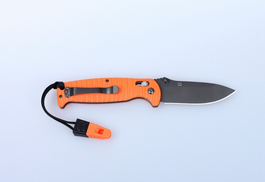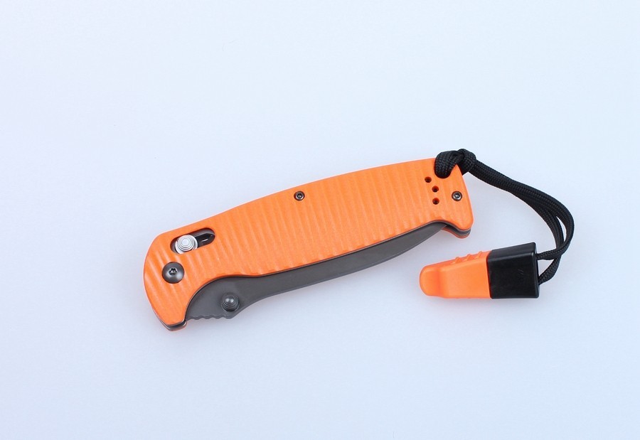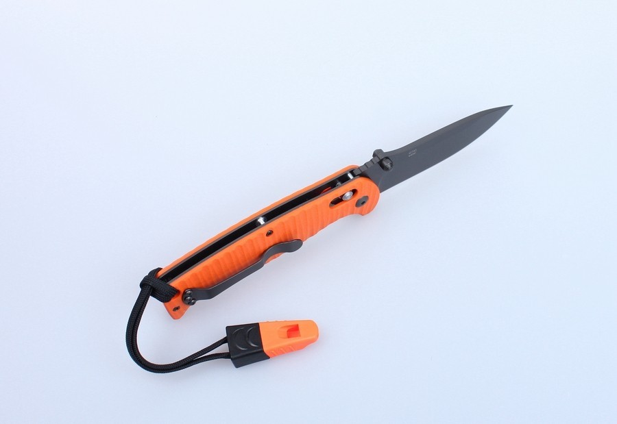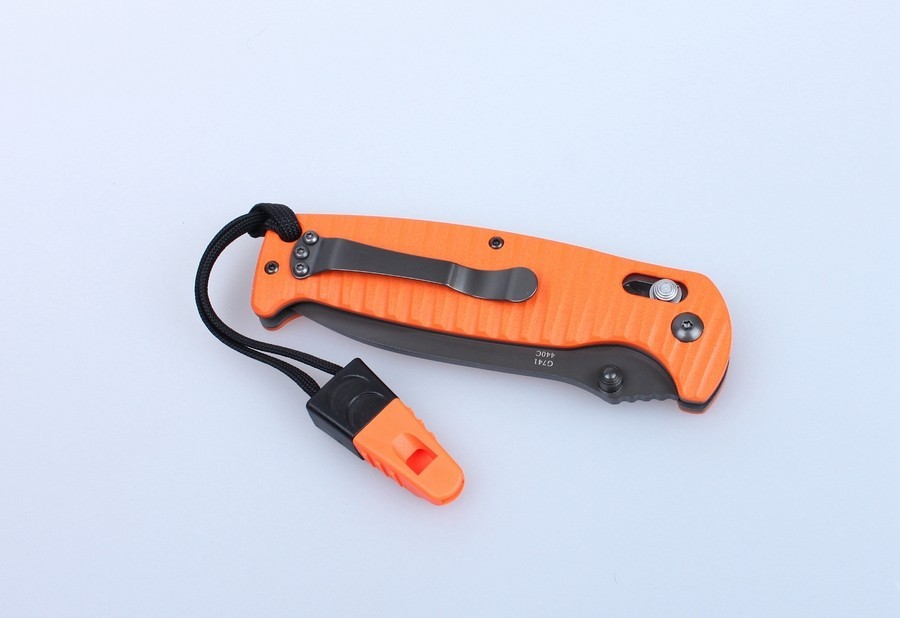 The knife length together with the handle is 205 mm. plastic cover plates with G10 label are bolted to the metal base of the handle. They are not completely smooth but with a small texture that does not allow the knife to slip. Since plastic is easily painted, the manufacturers offer three handle options: orange, black and green. In every options, a metal clip is attached to the knife handle and a small lanyard with a wistle.
