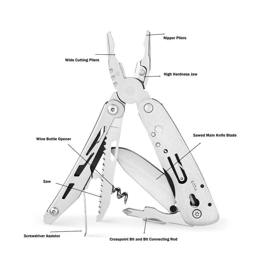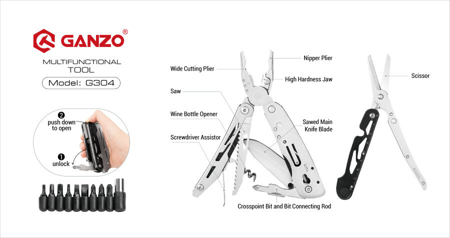 Echipat cu 18 instrumente diferite, instrumentul multiplu Ganzo G304 oferă o varietate de funcții pentru a rezolva multe sarcini de zi cu zi. G304 este un instrument esențial pentru orice călătorie sau expediție și chiar se potrivește într-o geantă de șold.