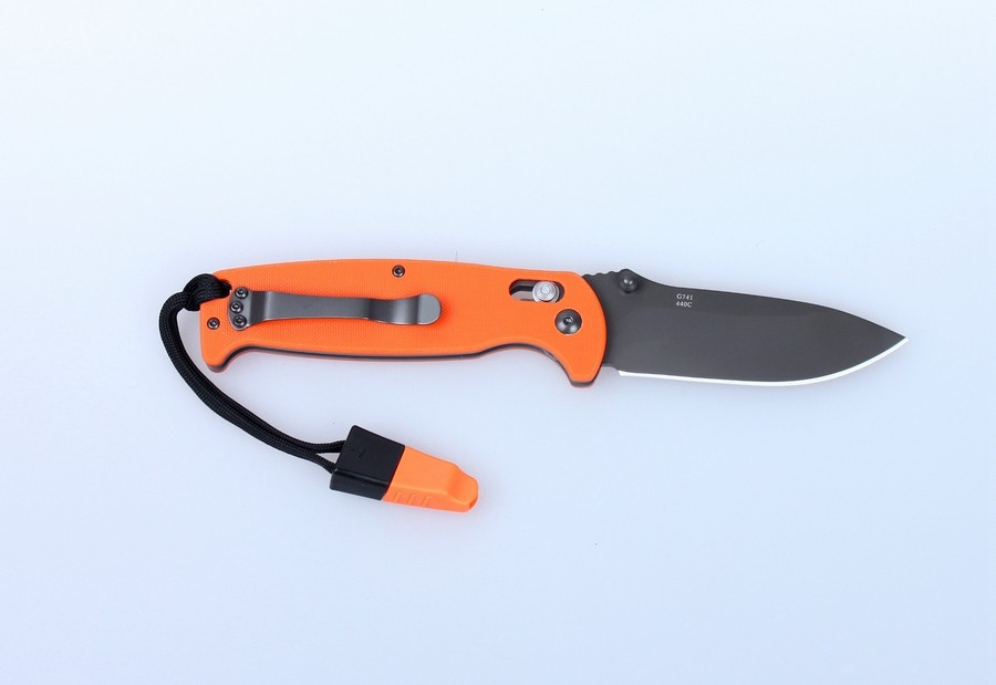 The knife length together with the handle is 205 mm. plastic cover plates with G10 label are bolted to the metal base of the handle. They are not completely smooth but with a small texture that does not allow the knife to slip. Since plastic is easily painted, the manufacturers offer three handle options: orange, black and green. In every options, a metal clip is attached to the knife handle and a small lanyard with a wistle.